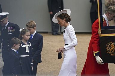 Kate viajó en coche de caballos desde el palacio de Buckingham con los hijos de la pareja -el príncipe Jorge, de 10 años, la princesa Carlota, de 9, y el príncipe Luis, de 6- antes de presenciar la ceremonia desde un edificio situado junto al patio de armas.